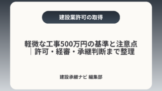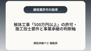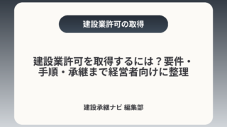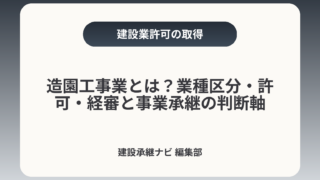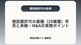 建設業許可の業種(29業種)早見と承継・M&Aの実務ポイント許可の業種(29業種)と「一般/特定」の区分を正しく把握し、経営業務の管理責任者・専任技術者・財産的基礎といった要件、さらに経審や許可証の“鮮度”、都道府県ごとの運用差を踏まえた上...