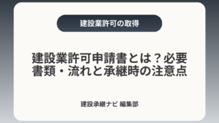 建設業許可申請書とは?必要書類・流れと承継時の注意点建設業許可申請書は、軽微工事を除く建設工事を行うために法的要件を示す重要な書類です。申請書そのものは要件を満たすかを行政が確認するためのもので、特に事業承継やM&Aの場面では「許可名義・経...