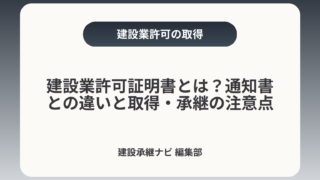 建設業許可証明書とは?通知書との違いと取得・承継の注意点建設業許可証明書は「現に許可を受けていること」を行政が証明する公式書類で、通知書や許可票とは用途が異なります。入札・融資・事業承継など経営判断に直結する場面では、様式や発行元(知事/大...