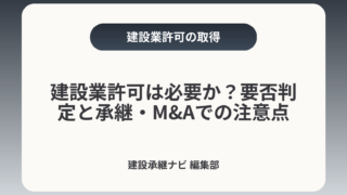 建設業許可は必要か?要否判定と承継・M&Aでの注意点建設工事の完成を請け負って営業する場合は原則として建設業許可が必要です。ただし、請負金額や工事の種類(いわゆる「軽微な工事」)に当てはまる場合は不要となることがあり、さらに承継・M&Aの手...