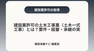 建設業許可の土木工事業(土木一式工事)とは?要件・経審・承継の実務土木一式工事の許可は、元請として大規模・複合的な土木工事を統括するための制度上の要件です。売却や事業承継では、許可そのものに加え経営事項審査(経審)や元請実績の扱い、代表者交...