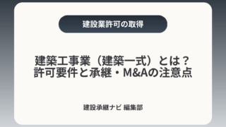 建築工事業(建築一式)とは?許可要件と承継・M&Aの注意点建築工事業(建築一式)は「建築物の新築・増改築などを総合的にまとめる工事」を指し、許可の有無や経営業務管理責任者・専任技術者といった人員要件が事業の継続性やM&Aでの評価に直結します...