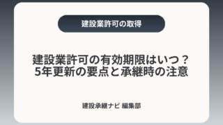 建設業許可の有効期限はいつ?5年更新の要点と承継時の注意建設業許可の有効期間は原則5年です。満了日の30日前までに更新申請が必要で、受付開始時期や細かな運用は都道府県ごとに異なります。M&A・事業承継の際は「許可の有効性」「経審・入札への連...