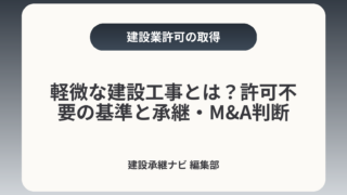 軽微な建設工事とは?許可不要の基準と承継・M&A判断軽微な建設工事は金額や工事の種類で「建設業許可が不要」になる場合がありますが、消費税や支給材の取り扱い、工事の分割、解体など別法令の登録、さらに承継・M&A時の許可・経審・元請実績への影響...