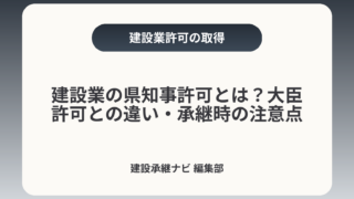 建設業の県知事許可とは?大臣許可との違い・承継時の注意点建設業の県知事許可は営業所が同一都道府県内にある事業者を対象とする建設業許可で、大臣許可とは営業所の所在都道府県数で区分されます。特にM&Aや事業承継では「許可そのもの」よりも専任技術...